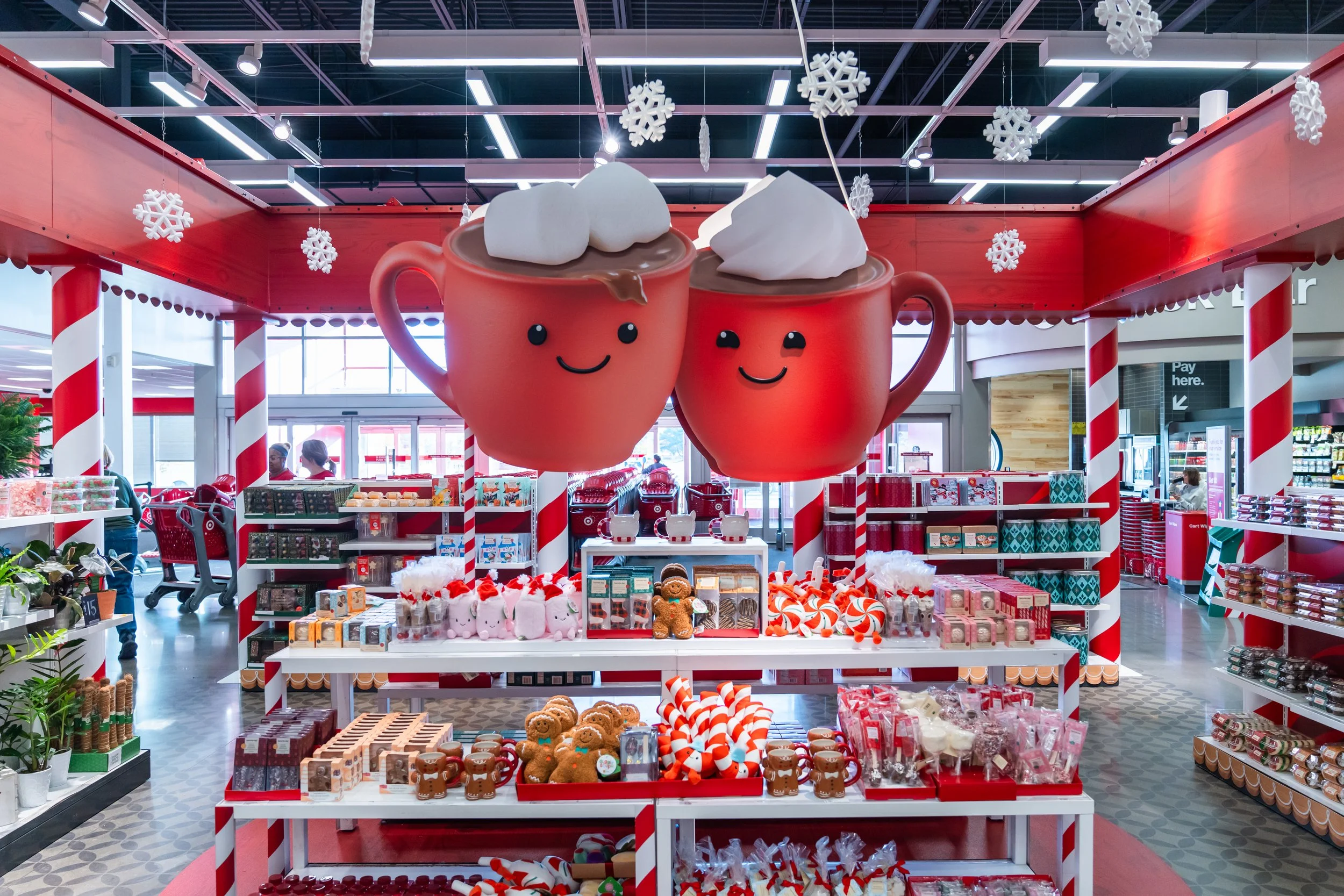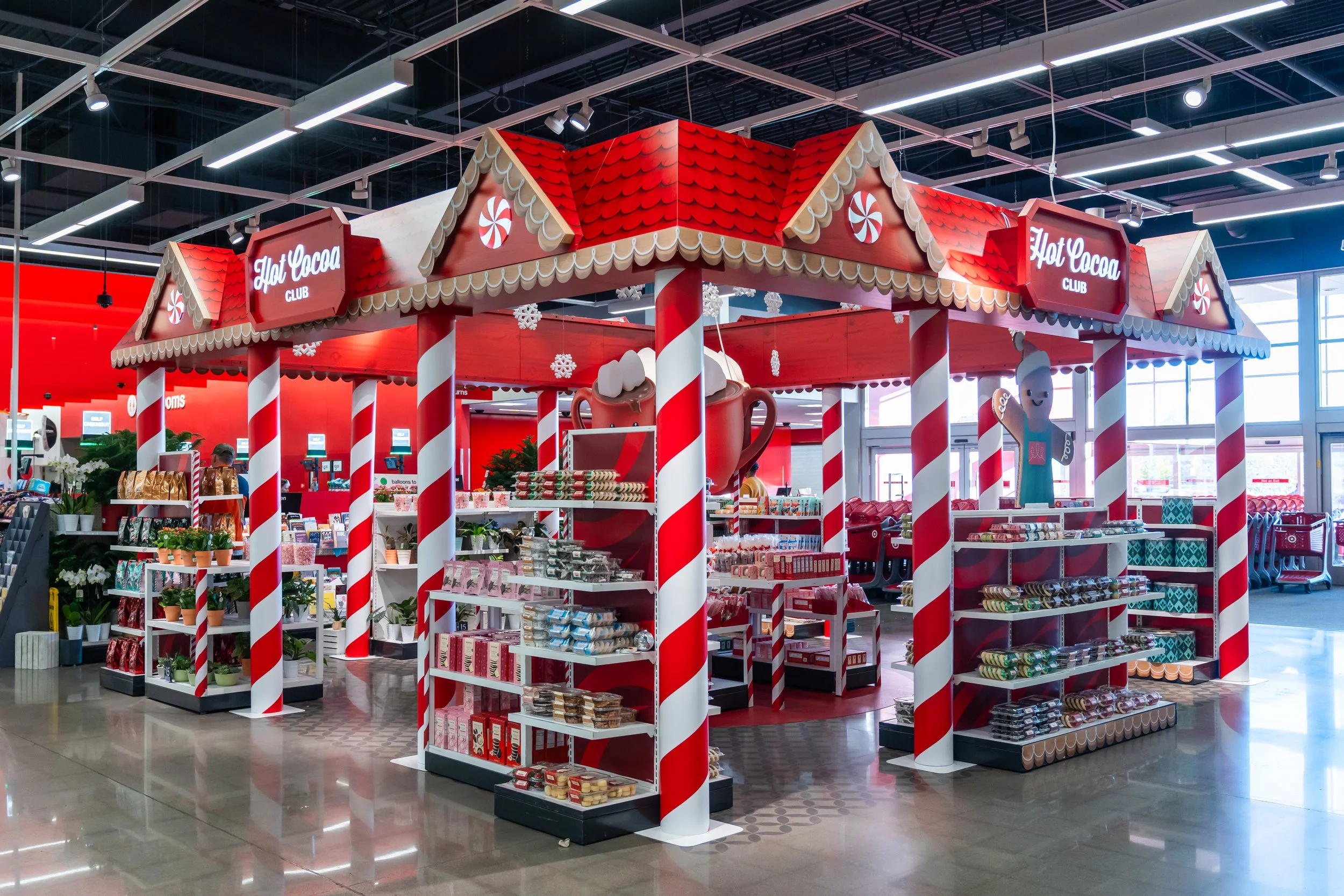 Designed to spotlight seasonal food, beverage, and owned-brand products, the space used scent, movement, and playful character design to draw guests in. Steaming cocoa mugs welcomed visitors at the entrance—setting a warm, immersive tone before they continued into the alpine-themed journey.